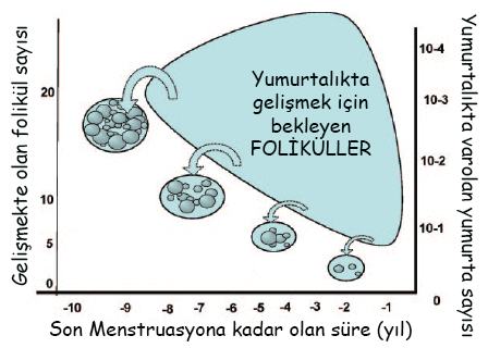 Prematüre Over Yetmezliği (Erken menopoz) önceden belirlenebilir mi? ![]() Erken over yetmezliği veya erken menopoz, özellikle çocuk sahibi olmak isteyen-ler için çok önem taşımaktadır. Bu nedenle de olası menopoz zamanının önceden belirlenebilmesi gereklidir. Kimin erken menopoza gireceği bilinmemektedir. Ancak kadınlar bir anda meno-poza girmezler, bu süreç belirli bir zaman alır. Bu nedenle son yıllarda geliştiri-len AMH gibi bazı testler en azından, 3-4 yıl öncesinde uyarı verebilir (Şekil). Genellikle yeni evlenmiş çiftler, gebelikten korunma konusunda hekime başvu-rurlar. Özellikle 30 yaşını aşmış böyle hastalarda daha dikkatli davranarak yu-murtalık reservini (Yumurtalıklardaki yumurta hücre sayısını) belirlemek için testler yapılması uygun olabilir. Böyle gerek klinik ve gerekse testler sonucunda prematüre over yetmezliği olasılığı bulunan bu hastalara, fertilite planlanmasın-da uyarıcı olmak, fazla beklememesi ve biran önce çocuk sahibi olması öne- Özellikle çocuk sahibi olmak isteyen hastalarda gebelikten korunma ve olası gebelik şansının belirlenmesi gibi konularda hekimler yol gösterici olmalıdır. Bu amaçla Over reserv belirteçleri yararlı olabilmektedir. Bu konuda kişisel deneyimlerimizin ve çalışmalarımızın gösterdiği gibi, kadının yaşı, şikayetleri, adet düzeni, ultrasonografide yumurtalıkların görünümü ve hormon testleri birlikte değerlendirildiğinde yararlı olabilmektedir. Hatta son yıllarda yapılan bazı çalışmalarda, bazı modeller oluşturularak, bir ka-dının kaç yaşında menopoza girebileceği dahi öngörülmektedir. Yani bir kadının kaç yaşında menopoza girebileceği tahmin edilebilmektedir. Bu amaçla, AMH öl-çümleri, 2 ölçüm arasındaki fark, anne menopoz yaşı gibi kriterler değerlendiril-mektedir. Ancak bu çalışmalarda, menopoz yaşına yakın olanlarda isabet olasılığı, daha güçlüdür (Şekil-3). Yani 30lu yaşlardaki bir insanın menopoz yaşını belirle-yebilmek, 40lı yaşlara oranla daha zayıftır. Bu konuda birden fazla kriter kulla-nılması ve hekimin deneyimi çok önemlidir. ![]() Şekil: Normalde, kadınlarda yumurta hücreleri oluştuktan itibaren, menopoza kadar olan dönemde devamlı azalma eğilimindedir. Bu nedenle menopoz öncesinde bu azalmış yumurta reservini belirleyebilmek mümkündür. |